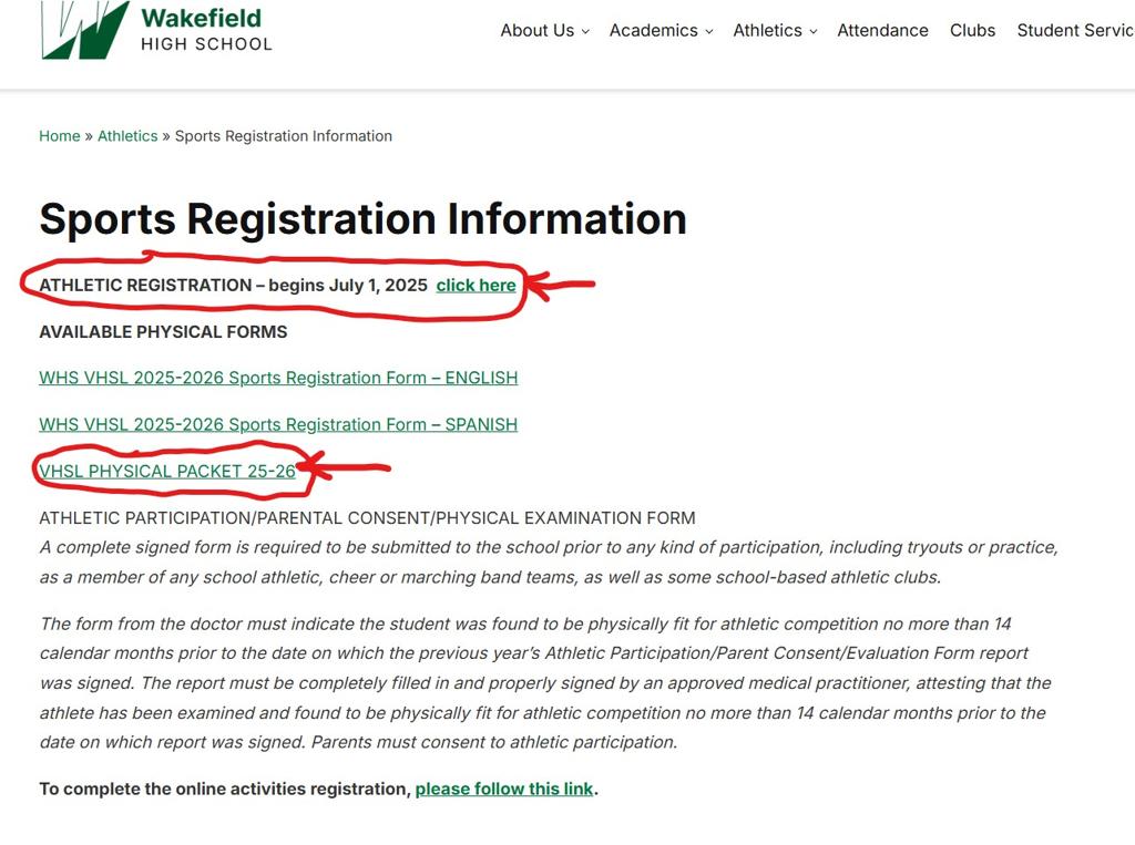 - Step 2: Register with Wakefield athletics by clicking on registration link on the same page (both things you need to click on are circled in the picture to the right). Fill out the required information and select: